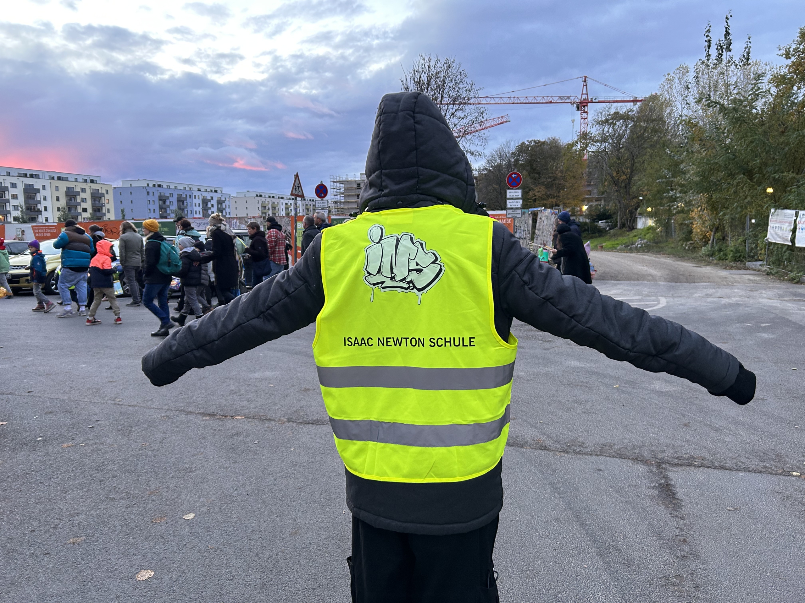 Die Schüler:innen der Isaac-Newton Schule zeigten ihr ehrenamtliches Engagement beim diesjährigen Laternenumzug in Schöneweide am 10 November 2023. Unter dem Motto „Sternmarsch für mehr Schulwegsicherheit“ sicherten 20 Schüler:innen der 8. und 10. Klassen gemeinsam mit der Polizei den Umzug für die teilnehmenden Familien und Kinder mit ihren bunten Laternen ab. Hierbei kamen unsere neuen Sicherheitswesten, welche durch den Förderverein der Isaac-Newton Schule gesponsert wurden, zum Einsatz! Gut sichtbar, auch in der Dunkelheit, wiesen unsere Schüler:innen den Weg, sperrten Straßen ab und sorgten für die Sicherheit der Teilnehmenden. Ein großes Dankeschön an euch!