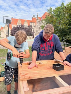 Im Rahmen der Aktion „Maker Spaces“, aus der unsere Schule als bundesweiter Gewinner hervorging, konnte nun die Einrichtung von offenen Lernräumen für innovatives, kreatives und kollaboratives Arbeiten vorangetrieben werden. Der Wahlpflichtkurs „FIT INS eigene Projekt“ hatte die Idee, den Schulhof mit neuen Sitzmöbeln zu verschönern und gleichzeitig eine ungenutzte Fläche als neue Schattenspender-Oase aufzuwerten. Gesagt, getan: in einem einwöchigen Workshop wurde unter Anleitung des professionellen Tischlers Tobias Beck gesägt, gebohrt und zementiert. Und nun stehen unserer Schülerschaft selbstgemachte neue Sitzwürfel zur Verfügung! Zudem wurde die hauseigene Holzwerkstatt mit neuen Maschinen ausgestattet, um weitere von der Schülerschaft gewünschte Projekte durchführen zu können.